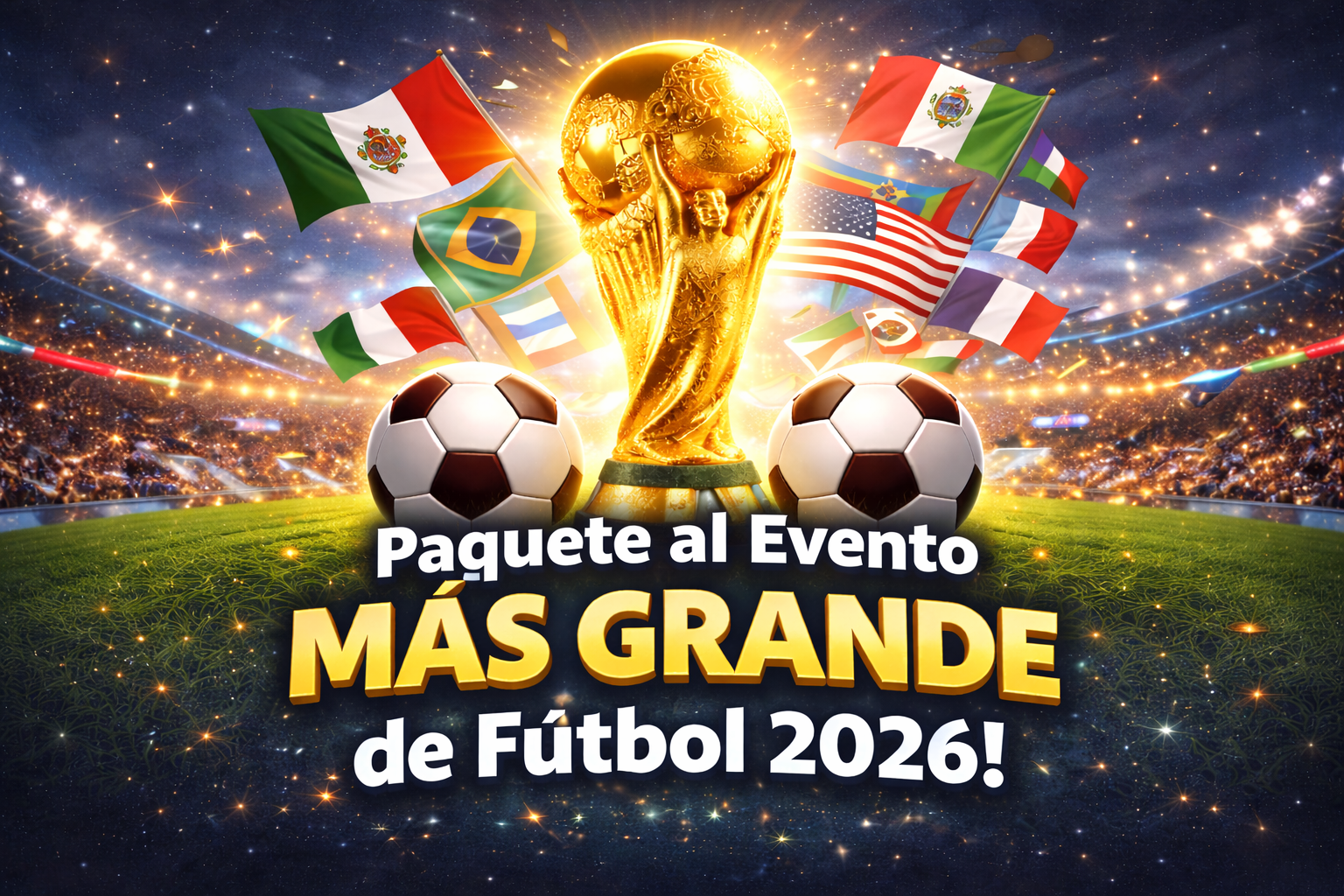 El paquete "EL EVENTO MÁS GRANDE DEL FÚTBOL" incluye entradas para uno de los eventos de fútbol más importantes de 2026. También incluye viaje, alojamiento, y 500 dólares para gastos.