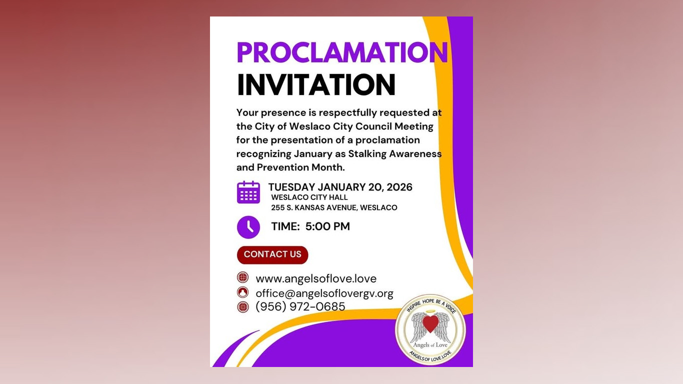 WESLACO, Texas — La organización Angels of Love, en colaboración con la Ciudad de Weslaco, invita a la comunidad a participar en la presentación oficial de una proclamación que designa enero como el Mes de Concientización y Prevención del Acecho.